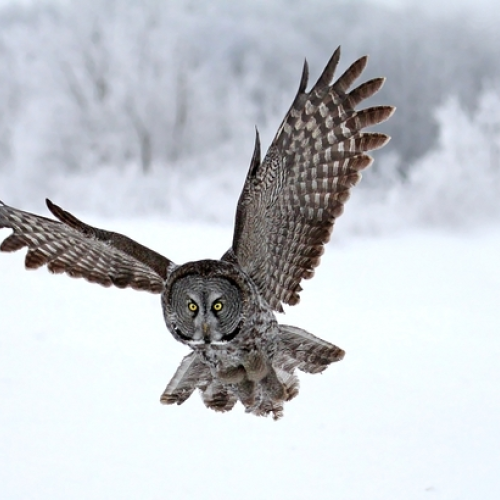 great gray owl flight flying hoarfrost saskatchewan raptor animal bird beak