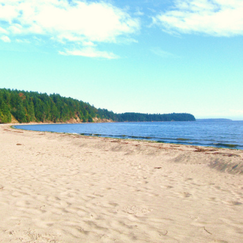 The Salish sea laps against the sandy beaches of Sidney Island, Gulf Islands National Park, British Columbia, Canada.