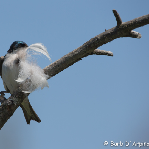 This is a female Great Crested Flycatcher with her beak full of nesting material. She would then place it just right on her nest while her mate sang away - their voice is a mix between a frog and a cricket, but I bet it sounds beautiful to her. We have named them Sonny & Cher, they are nesting in our backyard. I hope to be able to capture them from nest building to when their babies fledge.