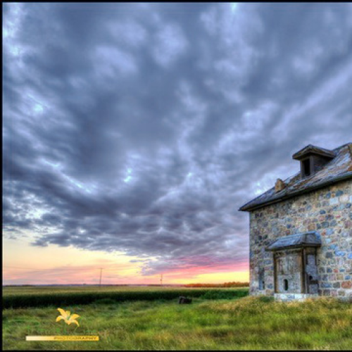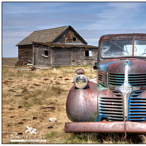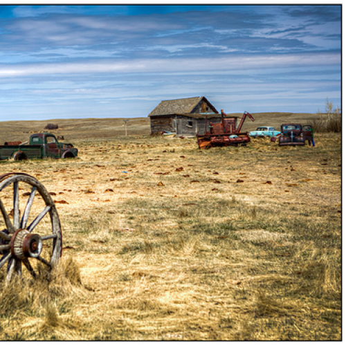 This is typical Saskatchewan geography. Prairie skies, valley, and fields of crops dotted with old abandoned homesteads.