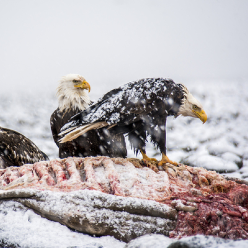 One young and two mature bald eagles feast on a sea lion carcass. Over a dozen eagles patiently waited in the snow storm early in the morning until the tide dropped low enough to expose the carcass. They feasted, feathers fully saturated and soaked to the bone, to warm their bellies with meat that will allow them to survive the winter.