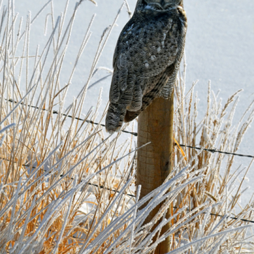 great horned owl bird of prey fence post frost snow feathers eyes winter