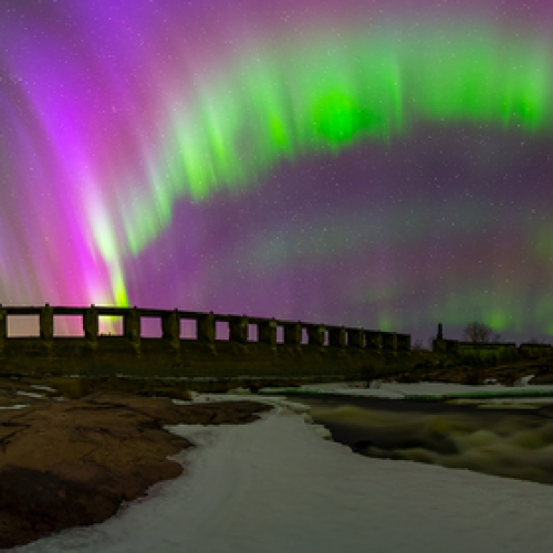 Biggest and baddest auroral display I've seen to date, This is 180 degree pano shot with 14mm and still I couldn't fit everything in the frame. Shot at Pinawa Dam ruins Manitoba, Canada.
