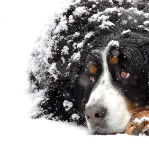Neighbours dog waiting patiently in the snow storm for his master to come home from work