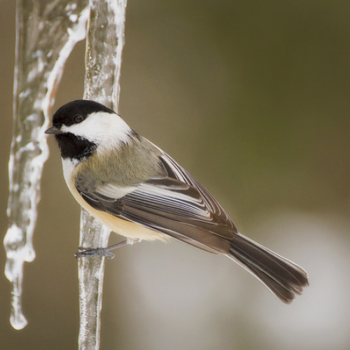 An icicle serves as a waiting spot for this chickadee as the feeder was full of other birds.