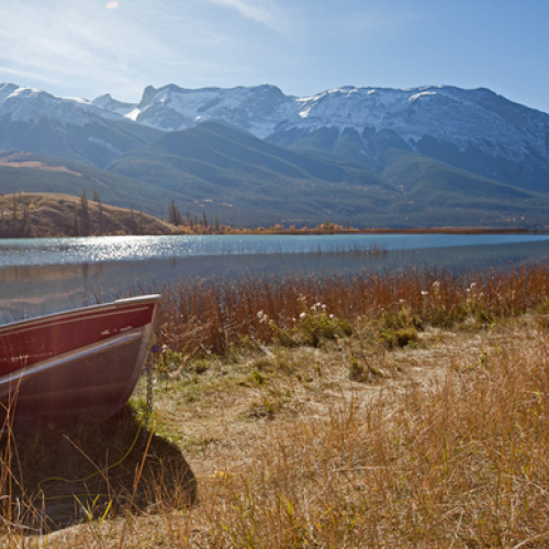 A red boat at the shoreline of Talbot Lake in Jasper National Park, Alberta