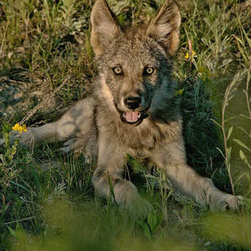 Pair of Coyote pups idly playing in the evening Sun, whilst two others, one sleeping another wandered in and out of the bush line for quite a minutes before all four of them sauntered off into the bush.
