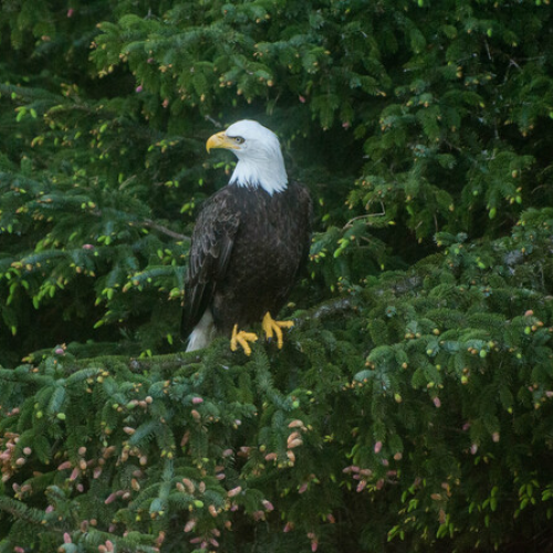 We have an eagle nest close by and others not far away so we're accustomed to seeing them on a regular basis but on this morning this particular eagle was perched in a spruce tree but only some 20 feet above the ground, instead of their preferred perch at the very top.