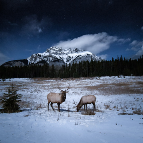 A single long exposure captures both two bull Elk and a night sky over Cascade Mountain of Banff National Park. The Elk stayed fixated on my movements just long enough to capture their pose whilst simultaneously opening the shutter long enough to expose the stars. A full moon out of shot aided in illuminating the snow and mountain, eliminating the need to light-paint the foreground.