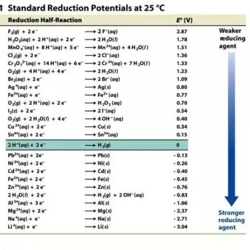 The standard reduction potential table states the reduction half-reaction and standard potential value as: F 2 (g) + 2 e- gives 2 F- (aq) : its standard potential E* (V) is 2.86. OF 2 (g) + 2 H+ (aq) + 4 e- gives H2O (I) + 2 F- (aq) : standard value E* (V) is 2.1. O 3 (g) + 2 H+ (aq) 2 e- gives O 2 (g) + H2O (I) : its standard value E* (V) is 2.075. S2O8 2- (aq) + 2 e- gives O 2 (g) + H2O (I) : the standard potential E* (V) is 2.01. H2O2 (aq) + 2 H+ (aq) + 2 e- gives 2 H2O (I) : its standard value E* (V) is 1.763.
