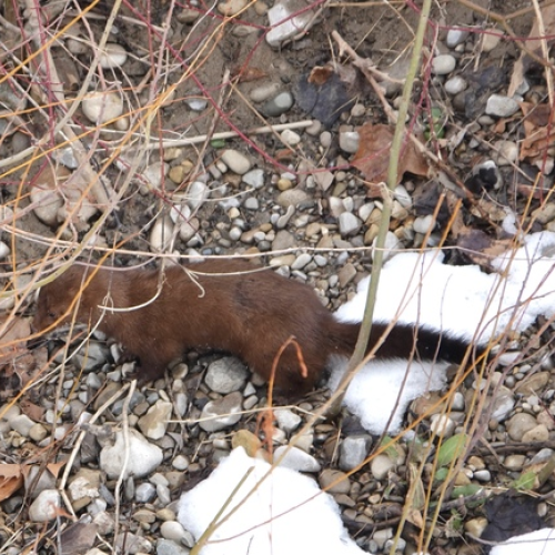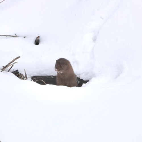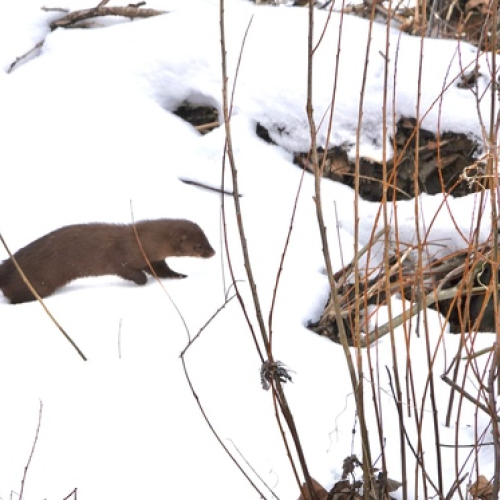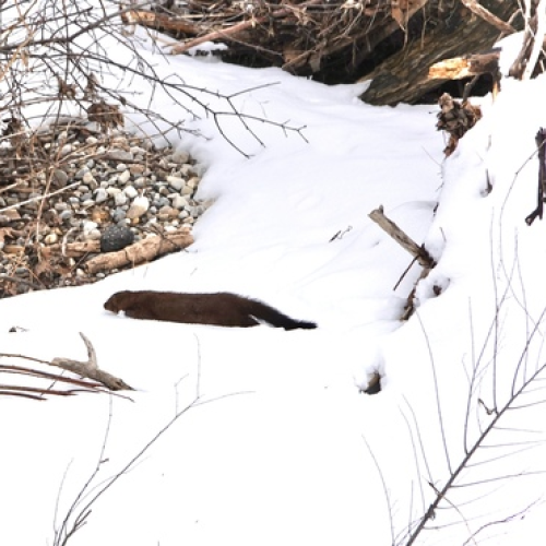 Easily spotted against the fresh snow I watched this mink scurrying & sleuthing.