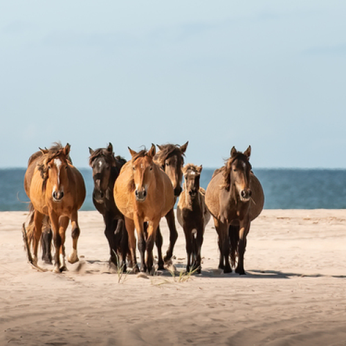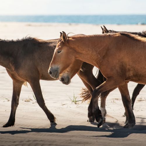 A family band of wild Sable Island horses walks along the shore on Sable Island National Park Reserve. (Taken with a zoom lens from a distance)