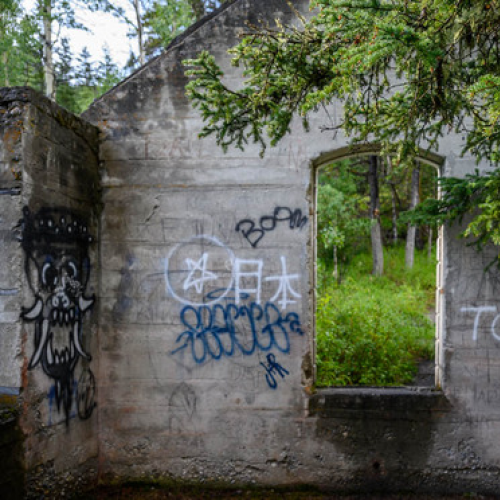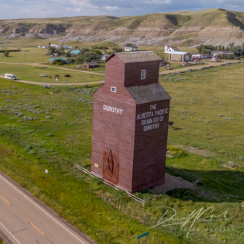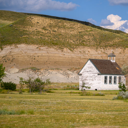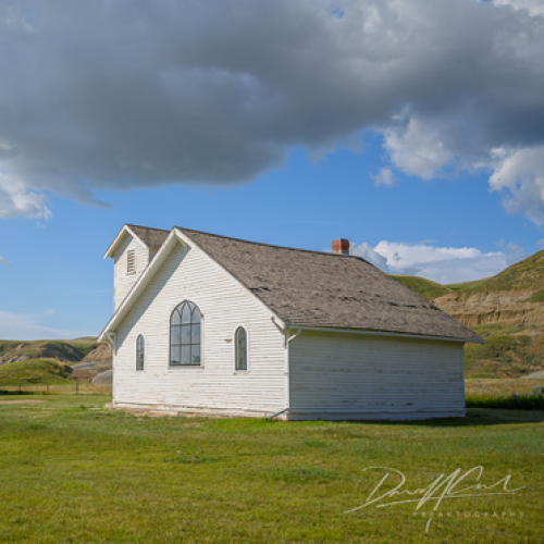 This is a single-frame, drone-lit shot of an abandoned church in Scrip, Saskatchewan.