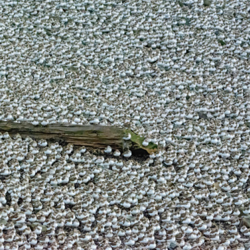 Hundreds of thousands of semipalmated sandpipers visit the upper region of the Bay of Fundy in August each year. They come to fatten up on tasty crustaceans found in the mud flats that become ezposed at low tide. This image shows them huddled together in snooze mode at high tide - there only chance to catch a few winks amid their busy feeding / bulking up schedule.