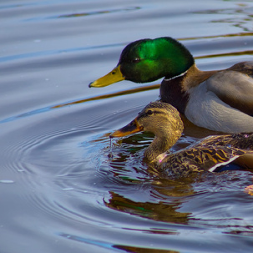 Merganser and Harlequin ducks sharing a resting place. The Cape Mudge Lighthouse is in the distance.