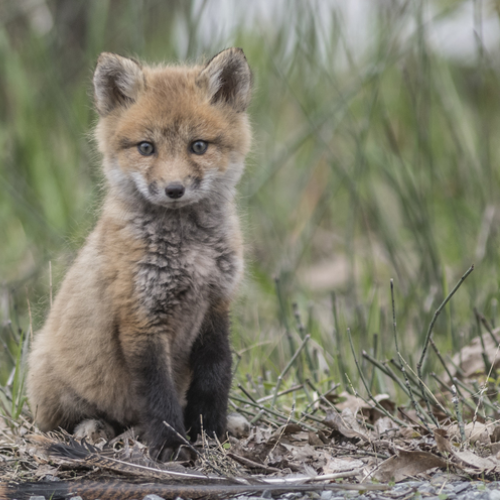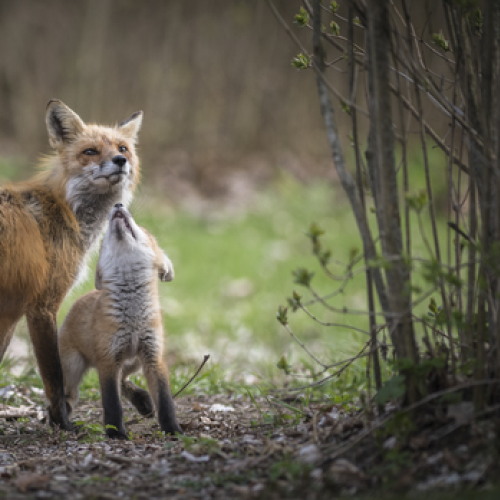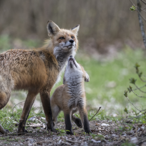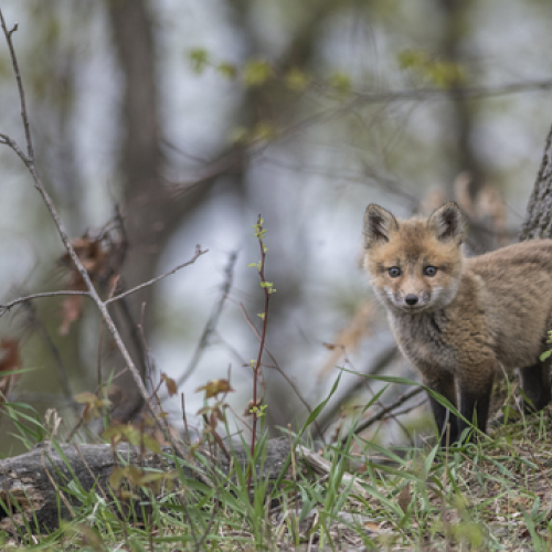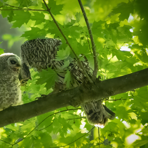 A barred owlet had just fledged its nest early morning. While edging along the branch, it fell to the ground, which is normal behaviour. It begins to look around for a tall tree to climb, with its talons and beak, and using wings for balance. This image was just after the owlet fell and was looking for the right tree.