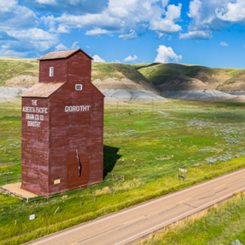 The historic red Dorothy grain elevator, built by the Alberta Pacific Grain Co., stands as a landmark in the Alberta Badlands. A reminder of prairie history and farming culture.