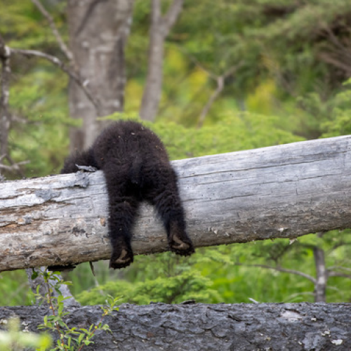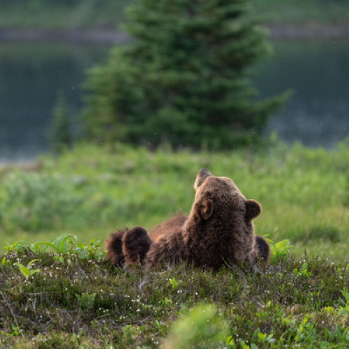 A grizzly relaxes on the hill overlooking Little Tom Mackay Lake.
