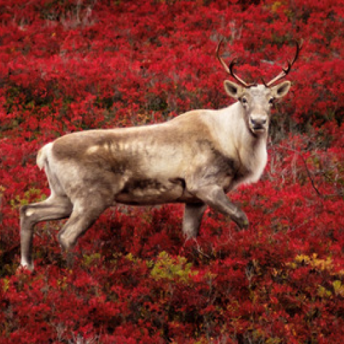 A woodland caribou (Rangifer tarandus caribou) pauses amidst the scarlet-tinted barrens of Newfoundland’s Burin Peninsula. Each autumn, the landscape ignites in deep reds and russets, mirroring the resilience of this isolated island population. It is one of the few places where caribou still roam freely in Atlantic Canada.