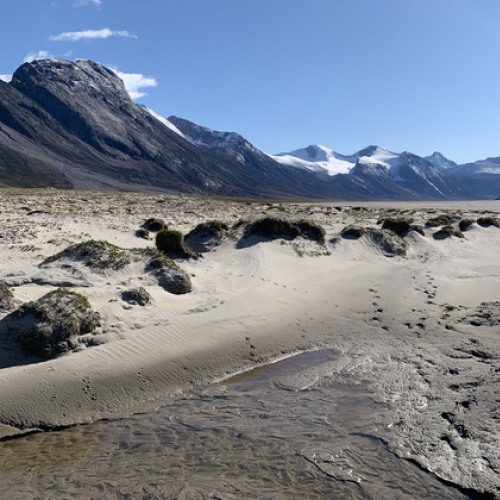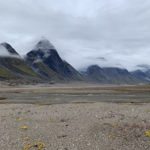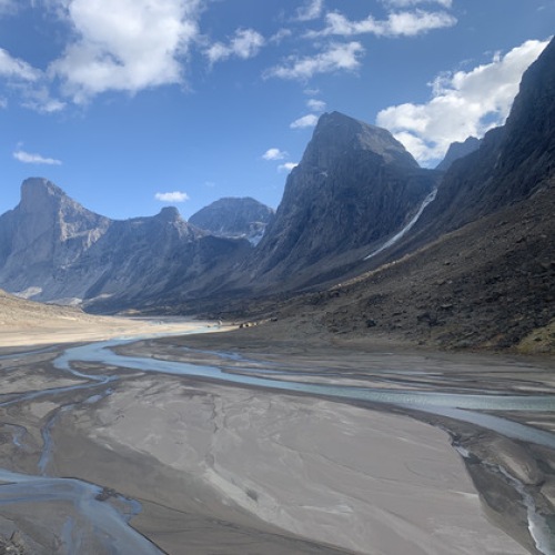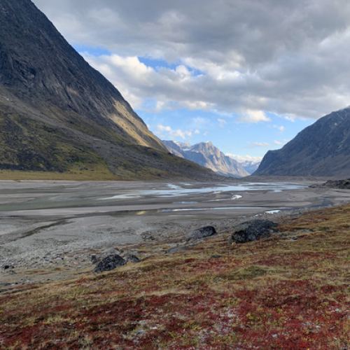A small unnamed pond in front of the larger Glacier Lake and Mount Asgard (right).