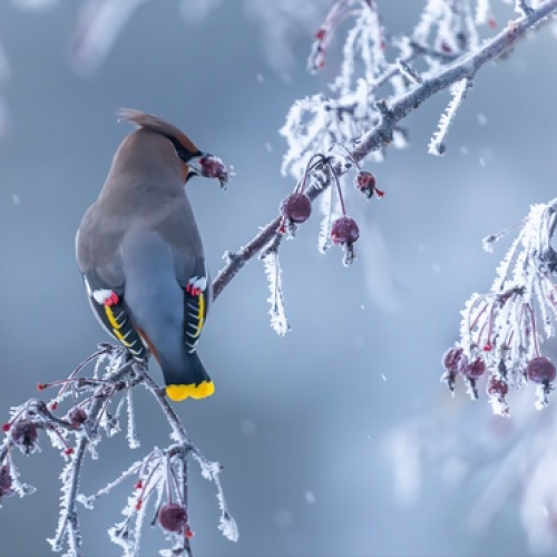 On my lunch break, I decided to take a drive around town, see if there was much around to photograph. We got our first official snowfall of the year and I wanted to see what was out in it. I wasn't seeing a whole lot of activity, but when I got to one last spot, that's when I started seeing some movement in the trees. I rolled my window down and could hear Bohemian waxwings, so I quickly stopped and got out to see them. There are a lot of berries in the trees and they are busy eating as much as they can.