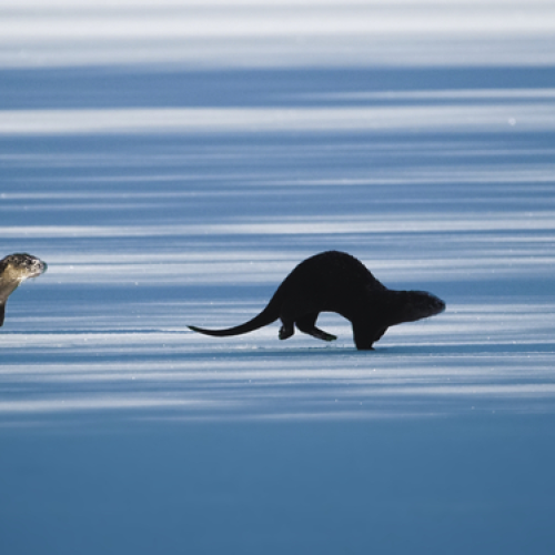 In the shafts of winter light a river otter chases its shadow across a frozen pond.