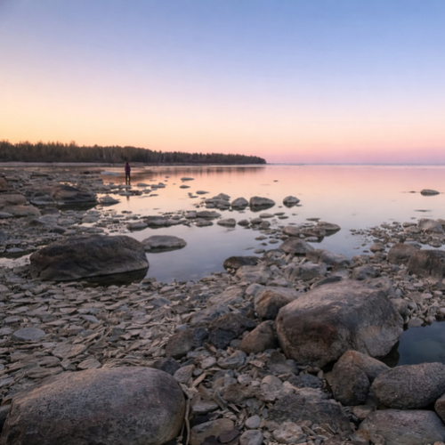 Lake Winnipeg at dusk when the water is still is a magical time. The water level was very low in the Spring of 2025, revealing rounded boulders, and rocks perfect for skipping stones