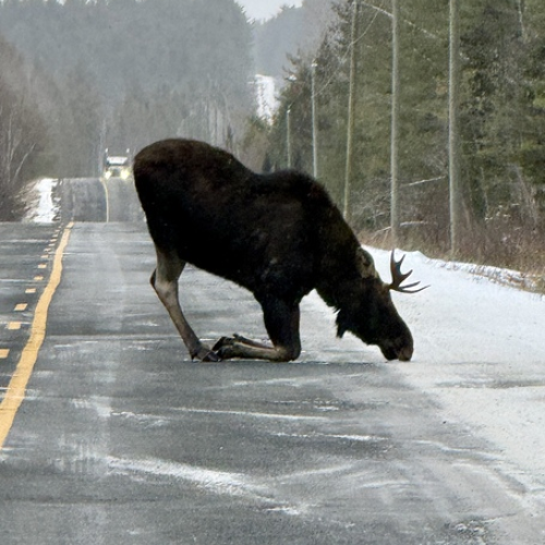 In the stillness of winter, a bull moose lingers along a northern roadway, licking salt left on the pavement.
