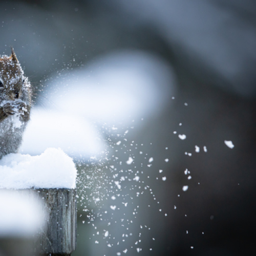 Along the trail this Red Squirrel frantically enjoys an afternoon snack in freshly fallen snow.
