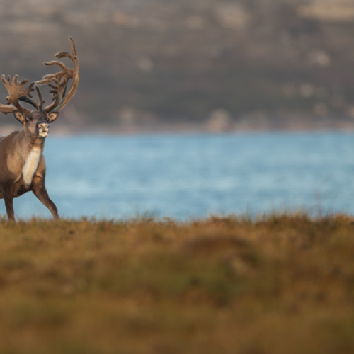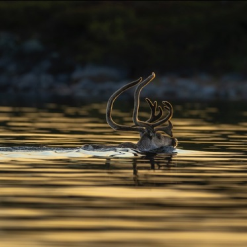 A barren-ground caribou illuminated in golden light swimming back to the mainland on Aylmer Lake, NT.