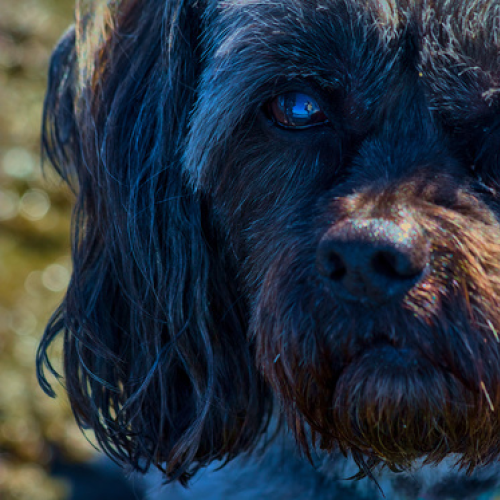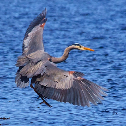 A Great Blue Heron amongst boulders at the ocean’s edge.