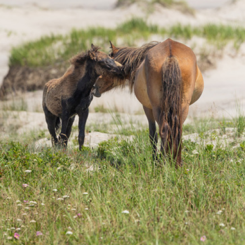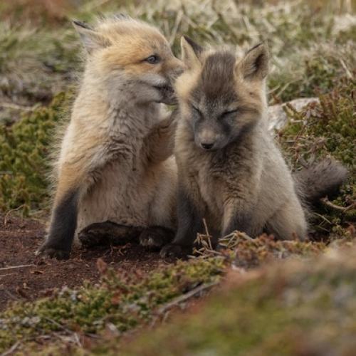 Two fox kits outside their den in a pose that appears like they are sharing a secret