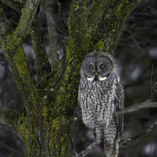 A great grey owl perched in a tree. The green giving off welcome colour on cold winter days.