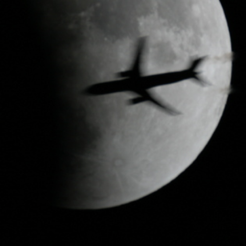 A lucky shot of a trans-atlantic flight, taken from St. John's Newfoundland during the lunar eclipse Feb 20, 2008