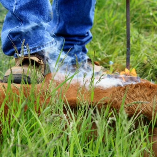 A close up photo of a calf being branded. Gorgeous late June day, west of Longview AB, the last ranch before the Kananaskis.